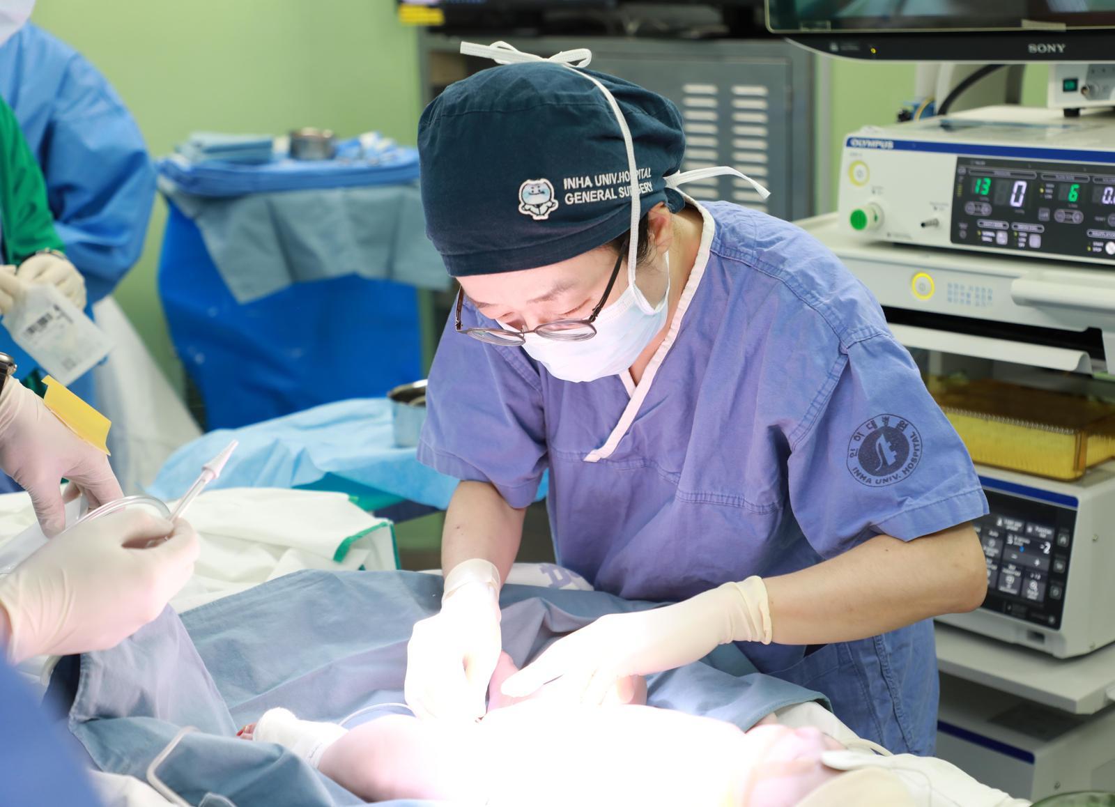 최윤미 인하대병원 소아외과 교수가 히르슈슈프룽병 치료를 위해 복강경 수술을 진행하고 있다. 인하대병원 제공