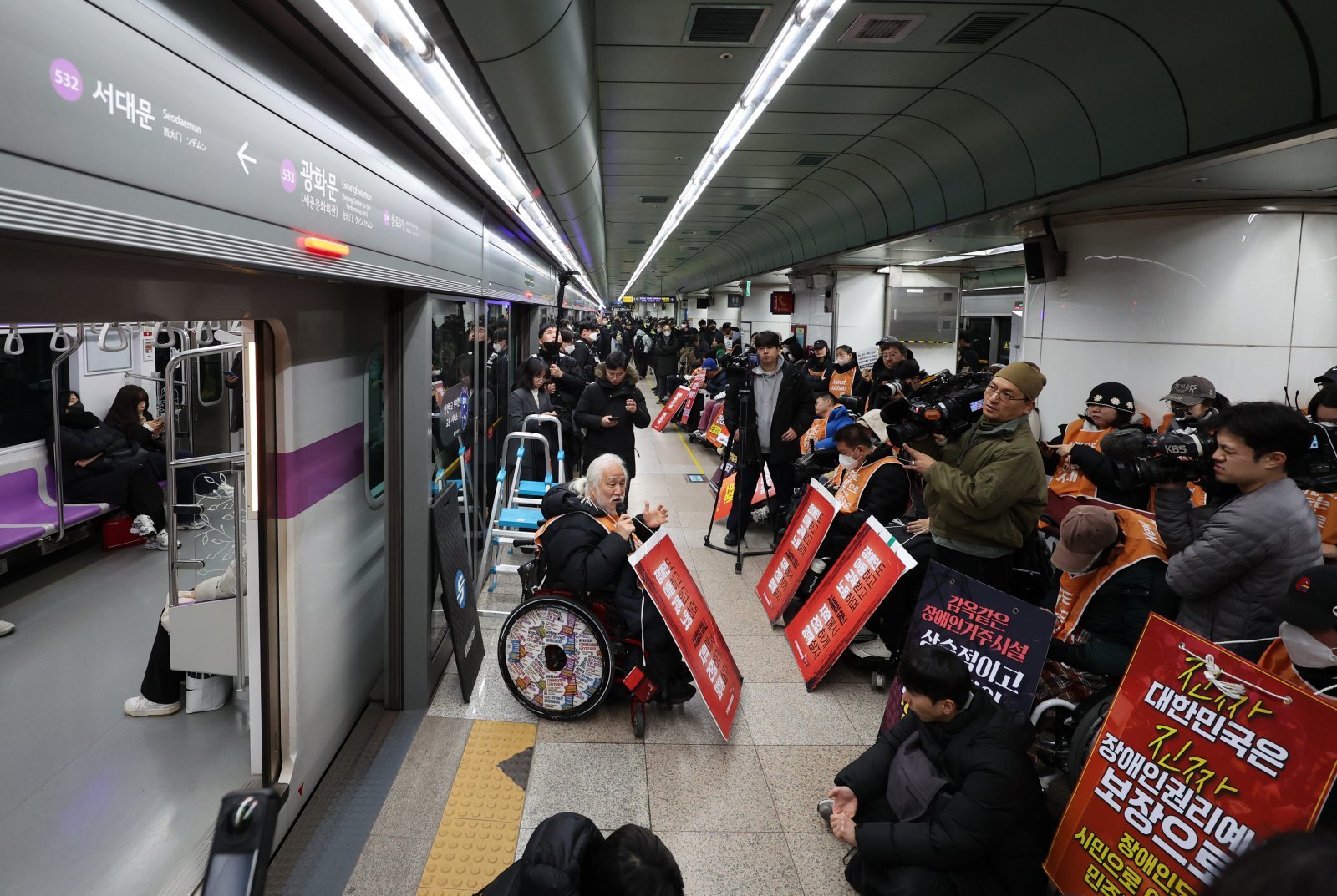박경석 전국장애인차별철폐연대(전장연) 상임공동대표가 12월 4일 오전 서울 종로구 지하철5호선 광화문역에서 열린 ‘제67차 출근길 지하철 탑니다’ 시위에 참석해 발언을 하고 있다. 2025.12.04 서울=뉴시스
