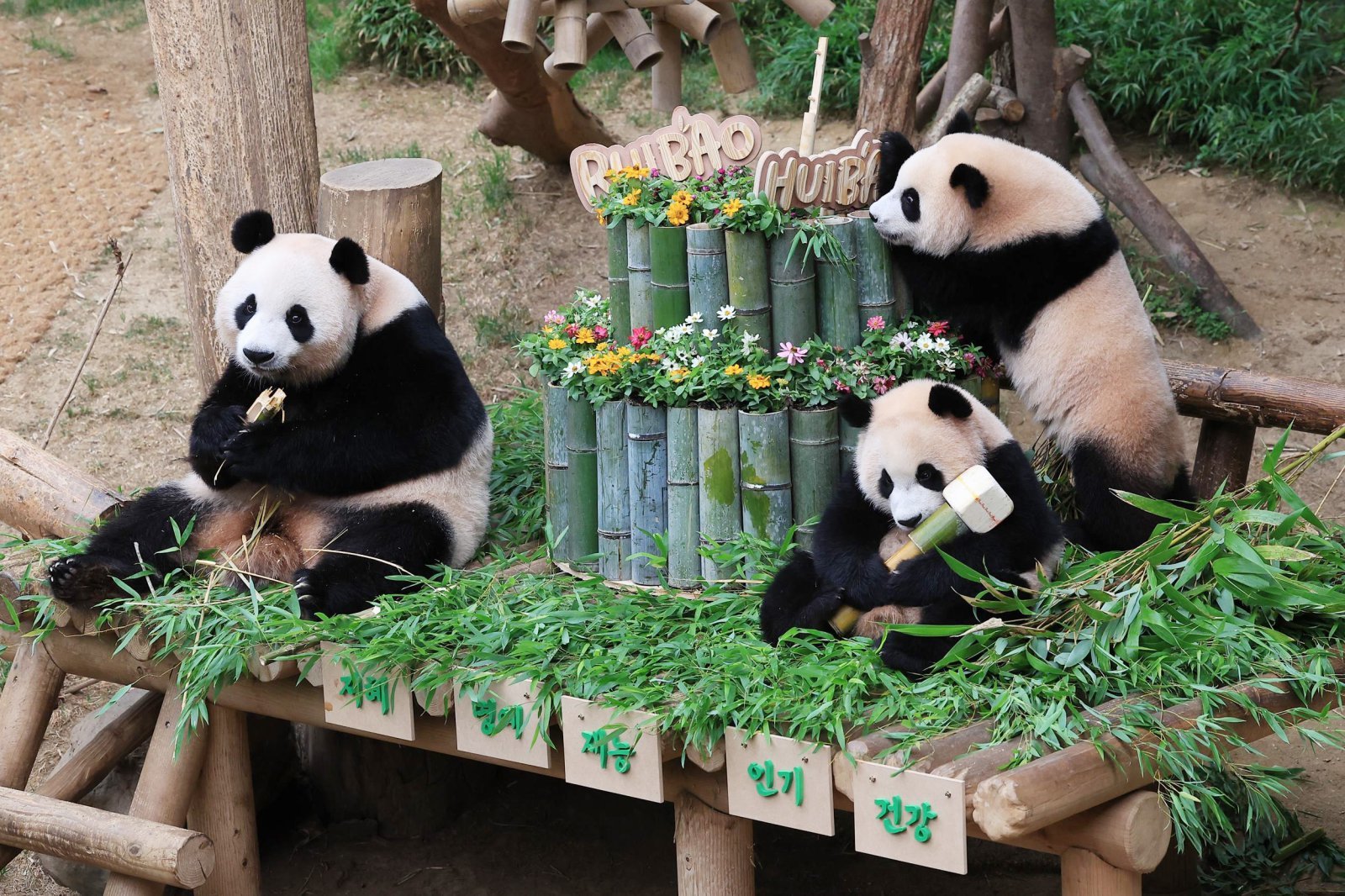 경기 용인시 에버랜드 판다월드에서 열린 푸바오의 동생 루이바오와 후이바오의 첫 생일맞이 돌잔치에서 엄마 아이바오가 쌍둥이 자매와 행복한 시간을 보내고 있다. 루이바오와 후이바오는 지난해 7월 7일 엄마 아이바오와 아빠 러바오 사이에서 태어났다. 돌잔치는 에버랜드가 사전에 진행한 돌잔치 이벤트를 통해 초청한 60명의 팬들과 에버랜드 동물원 직원들이 참석했다. 돌잔치의 하이라이트는 판다들의 돌잡이였다. 쌍둥이 판다의 건강과 행복한 판생을 바라며 대나무로 만든 붓, 판사봉, 공, 마이크, 아령이 준비됐다. 이날 루이바오는 아령을, 후이바오는 마이크를 잡았다. 에버랜드 제공