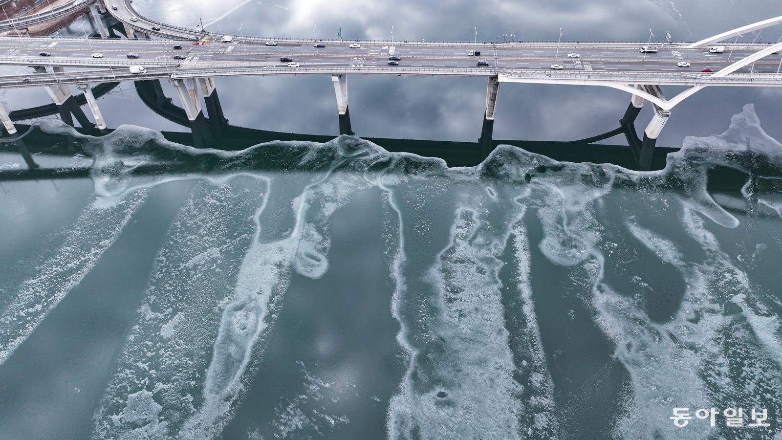 6일 경기 구리시 토평동 구리암사대교 인근 한강이 일부 얼어 있다. 이날 전국 내륙을 중심으로 아침 기온이 영하 10도 안팎까지 떨어졌다. 7일 아침 최저기온은 영하 5도∼영상 3도, 낮 최고기온은 영하 1도∼영상 9도로 예상된다. 이날 오후 북쪽에서 찬 공기가 내려오면서 추운 날씨가 이어질 것으로 보인다.