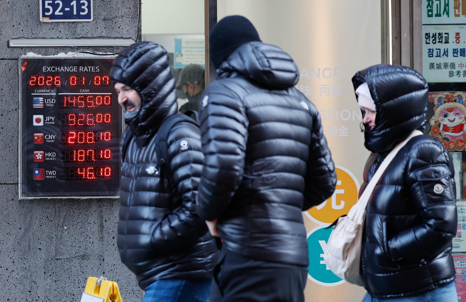 7일 서울 중구 명동의 환전소 앞에서 관광객들이 대화하며 걸어가고 있다. 2026.1.7 뉴스1