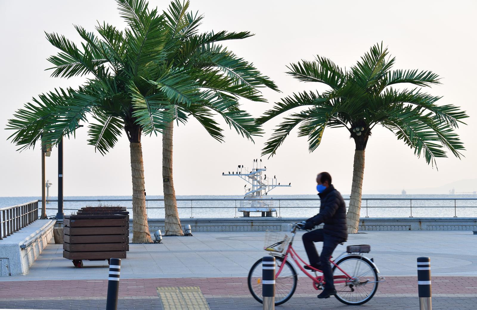 7일 경북 포항시 송도해수욕장 인공 야자수 앞으로 자전거를 탄 시민이 지나가고 있다.