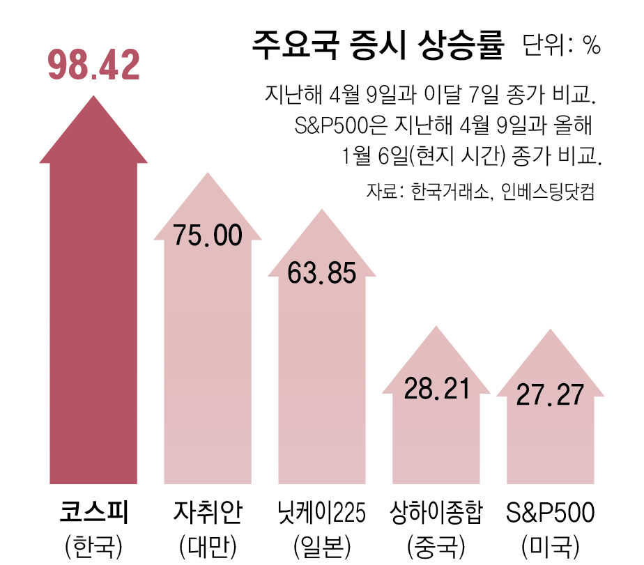 글로벌 증시가 강세를 이어가는 가운데 한국 증시는 ‘코리아 디스카운트’ 해소 기대감이 맞물려 더 큰 폭의 상승세를 보였다. 지난해 4월 트럼프 대통령이 상호관세 방침을 밝힌 여파로 글로벌 증시가 급락했던 지난해 4월 9일 코스피 종가는 2,293.7까지 하락했다. 9개월 만에 2,257.36포인트(98.4%)나 상승하며 두 배로 올랐다. 상장기업 시가총액도 같은 기간 1880조 원에서 2배인 3759조 원으로 불어났다. 이 기간 코스피의 상승 폭은 같은 기간 일본 닛케이225 평균주가(67%), 대만 자취안지수(75%)보다 두드러진다.