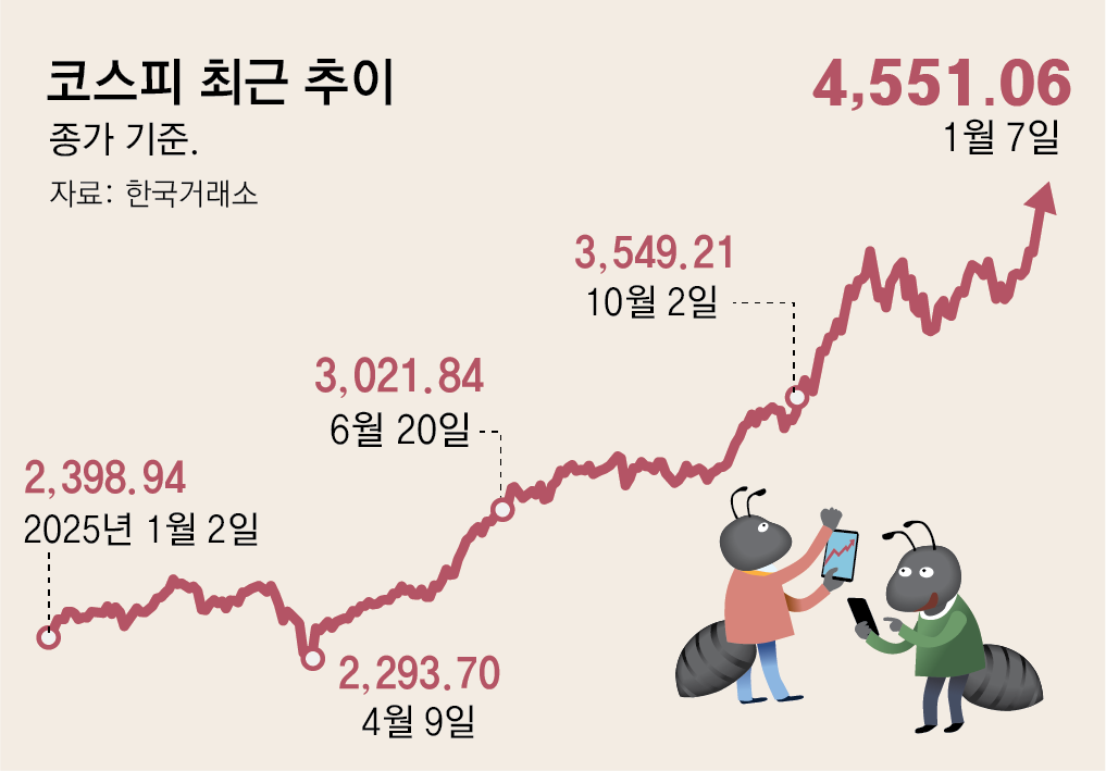 지난해 4월 관세전쟁의 여파로 2,300 선이 깨졌던 코스피가 불과 9개월 만에 2배로 뛰었다. 미국과 중국의 치열한 인공지능(AI) 패권 경쟁에서 존재감이 커진 반도체의 영향 때문이다. 조선, 방산, 원자력, 로봇 등 한국 기업의 경쟁력이 재조명된 것도 긍정적으로 작용했다. 전날까지 코스피가 3거래일 연속 100단위 숫자를 올리며 빠르게 치솟고, 증권사들이 올해 코스피 전망치를 올리자 투자 심리도 탄력을 받은 것으로 보인다.