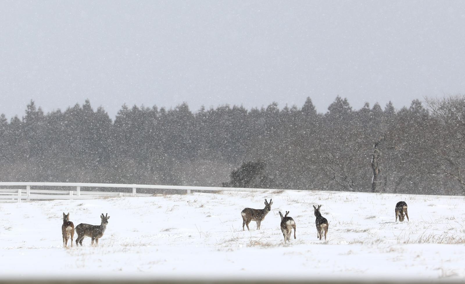 제주 제주시 조천읍 한국마사회 제주목장에서 노루들이 먹이를 찾아다니고 있다.2025.2.9/뉴스1