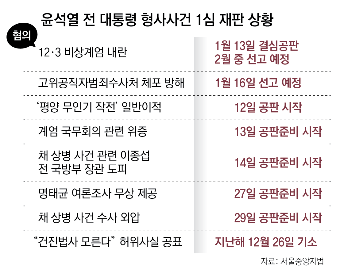 윤석열 전 대통령의 내란 우두머리 혐의 결심공판이 13일로 미뤄졌지만 1심 선고는 예정대로 2월 중 이뤄질 것으로 보인다. 다만 이와 별개로 윤 전 대통령과 관련한 나머지 재판은 기존 일정대로 진행된다. 윤 전 대통령 재판 중에선 고위공직자범죄수사처(공수처) 체포 방해 혐의 재판 1심 선고가 16일 가장 먼저 이뤄진다. 이를 제외한 나머지 6개 형사사건 재판은 이달부터 주 2∼4회 기일을 열고 진행될 예정이다. 상반기 내내 윤 전 대통령에 대한 재판이 이어지게 되는 것.