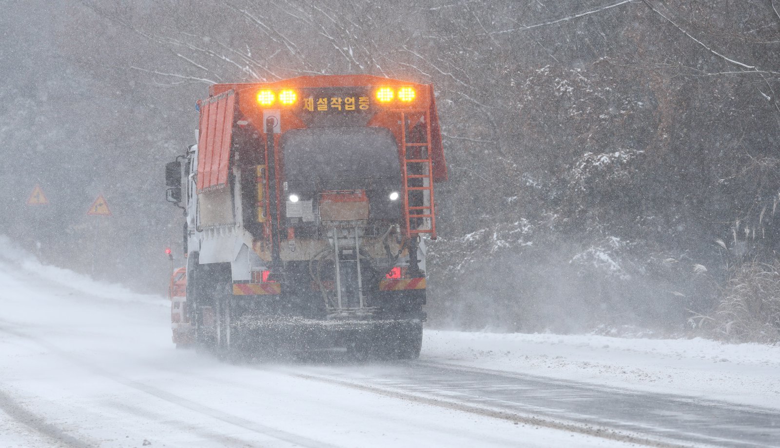 제주도 산지에 대설특보가 발효된 2일 오전 제주시 노형동 어승생 삼거리 인근 도로에서 제설차가 눈을 치우고 있다. 2026.01.02. 뉴시스