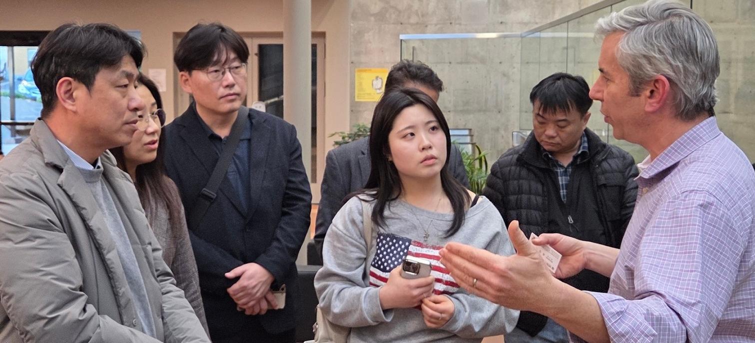 최성아 대전시 정무경제과학부시장(앞줄 왼쪽)이 8일(현지 시간) 버클리 캘리포니아대(UC버클리)에 있는 바카 바이오랩을 방문해 관계자로부터 연구 창업 지원에 대한 설명을 듣고 있다. 대전시 제공