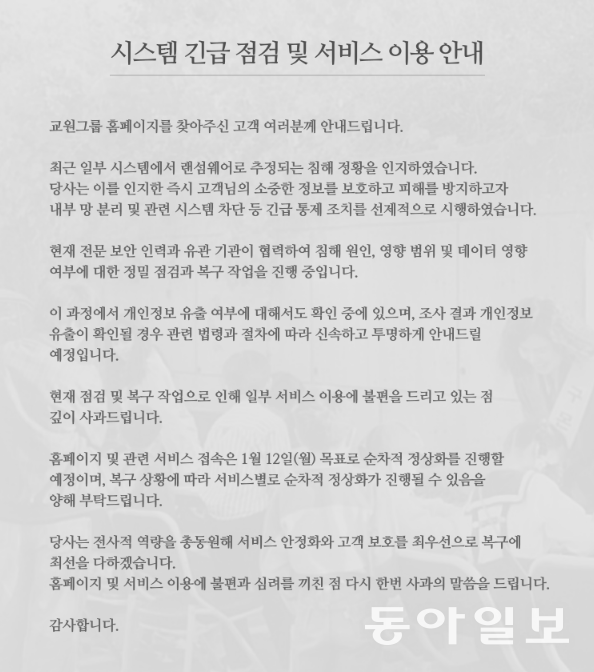 교원그룹은 12일 “최근 랜섬웨어로 추정되는 사이버 침해 정황을 인지하고 비상대응 체계를 가동했다”며 “개인정보 유출 여부는 확인 중”이라고 밝혔다. 교원그룹에 따르면 10일 오전 새벽 랜섬웨어 공격으로 계열사 전반에서 홈페이지 접속 장애와 내부 시스템 오류가 발생했다. 서비스 장애가 발생한 곳은 출판업체 교원구몬, 상조서비스업체 교원라이프, 여행업체 교원투어(여행이지), 가전렌탈업체 교원웰스 등 대부분 계열사가 포함됐다.