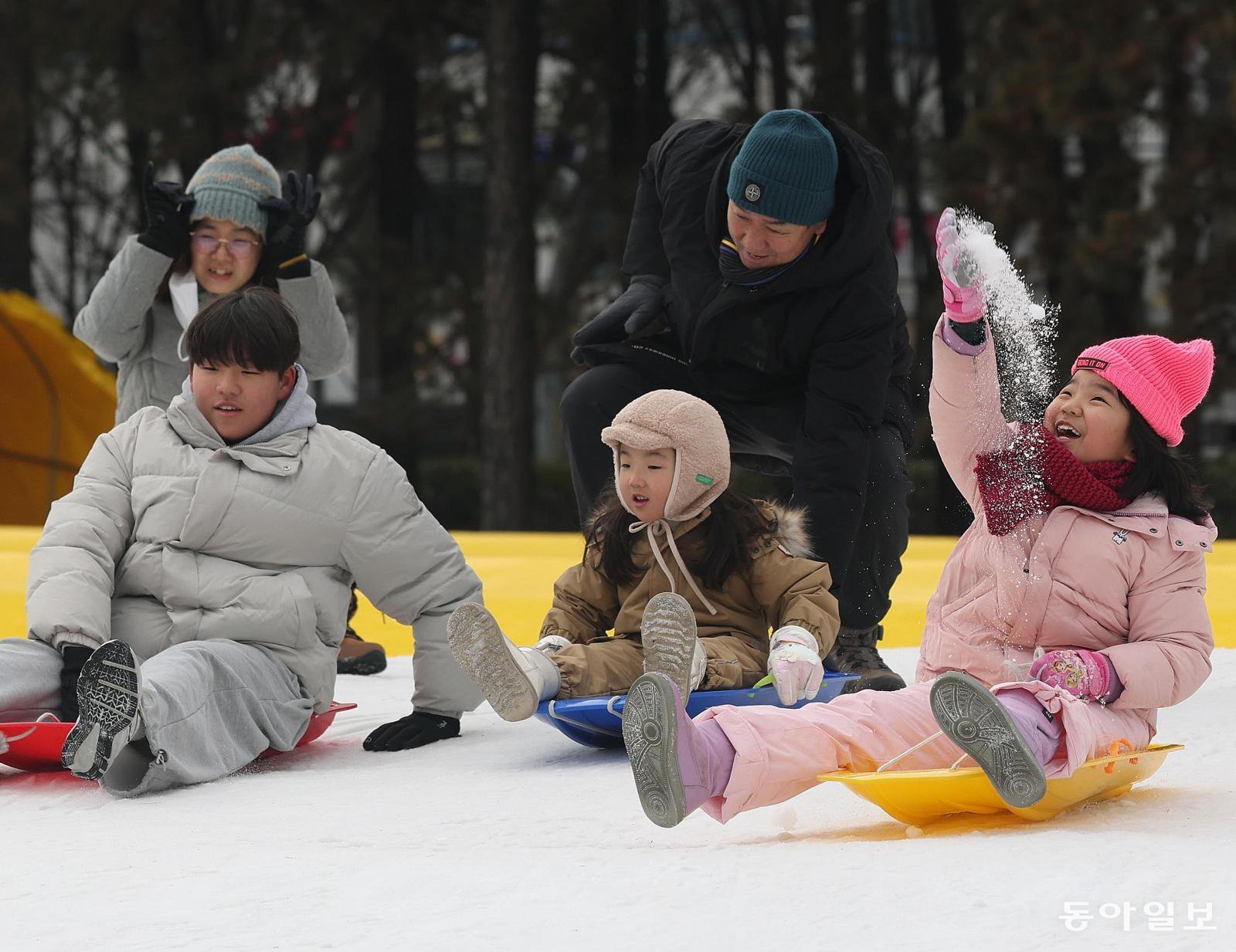 12일 서울 노원구 서울과학기술대 캠퍼스에 설치된 ‘2026 노원 눈썰매장’에서 방문객들이 썰매를 타고 있다. 노원구는 이날 관내 장애인 및 가족, 활동지원사 등 500여 명을 눈썰매장에 초청했다.