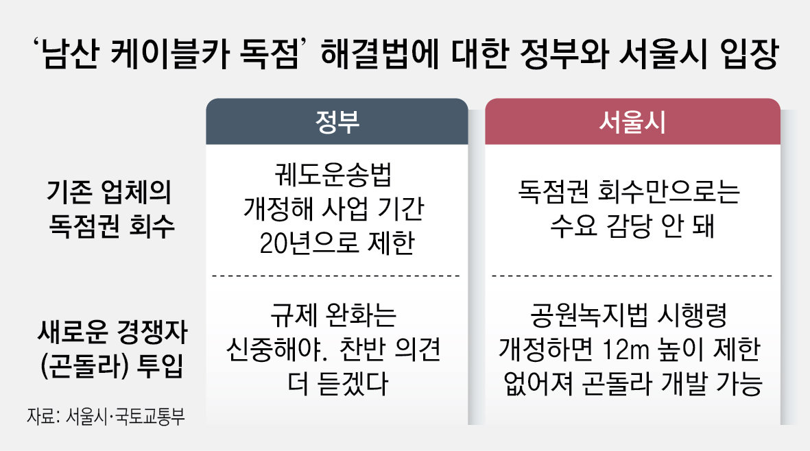 정부의 협조를 받아 해결해 보려는 서울시의 시도 역시 큰 진척을 보지 못하고 있다. 국토교통부는 서울시가 건의한 공원녹지법 시행령 개정안에 대해 6개월 넘게 최종 결정을 미루고 있다. 해당 시행령을 개정해야 현재 12m로 제한된 남산 시설물 높이 규정이 완화돼 곤돌라 기둥을 세울 수 있다. 하지만 국토부는 환경 훼손을 우려하는 시민단체의 목소리와 개발을 지지하는 찬반 여론이 팽팽하다는 이유로 신중한 태도를 고수하고 있다.