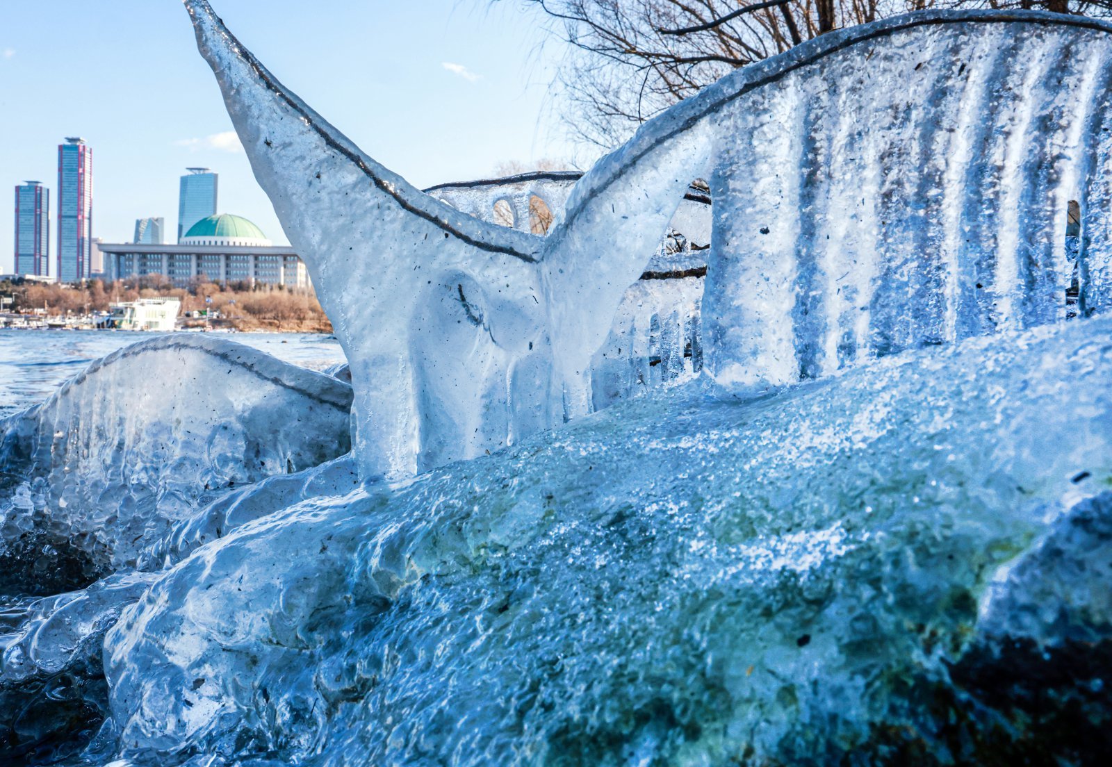 한낮에도 영하권 추위가 이어진 13일 오후 서울 영등포구 여의도 인근 한강에 고드름이 얼어있다. 2026.1.13 뉴스1
