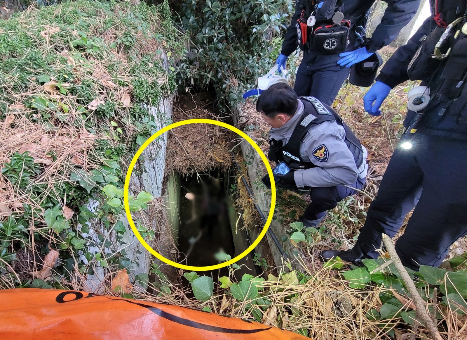 수색에 난항을 겪던 김 경장은 수풀 5m 아래 배수로에서 “살려주세요, 여기 있어요”라는 소리를 들었다. 김 경장은 곧바로 배수로에 떨어져 있는 여성을 발견해 구조했다. 신고 접수 16분 만이었다.