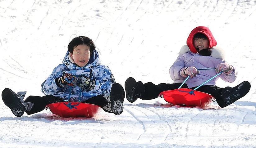 14일 대구 달서구 이월드 눈썰매장에서 어린이들이 눈썰매를 타며 즐거운 시간을 보내고 있다. 이날 대구 한낮 기온은 영상 7도까지 올라 추위가 한풀 꺾였지만 대구와 경북 동해안에 건조주의보가 내려졌다.