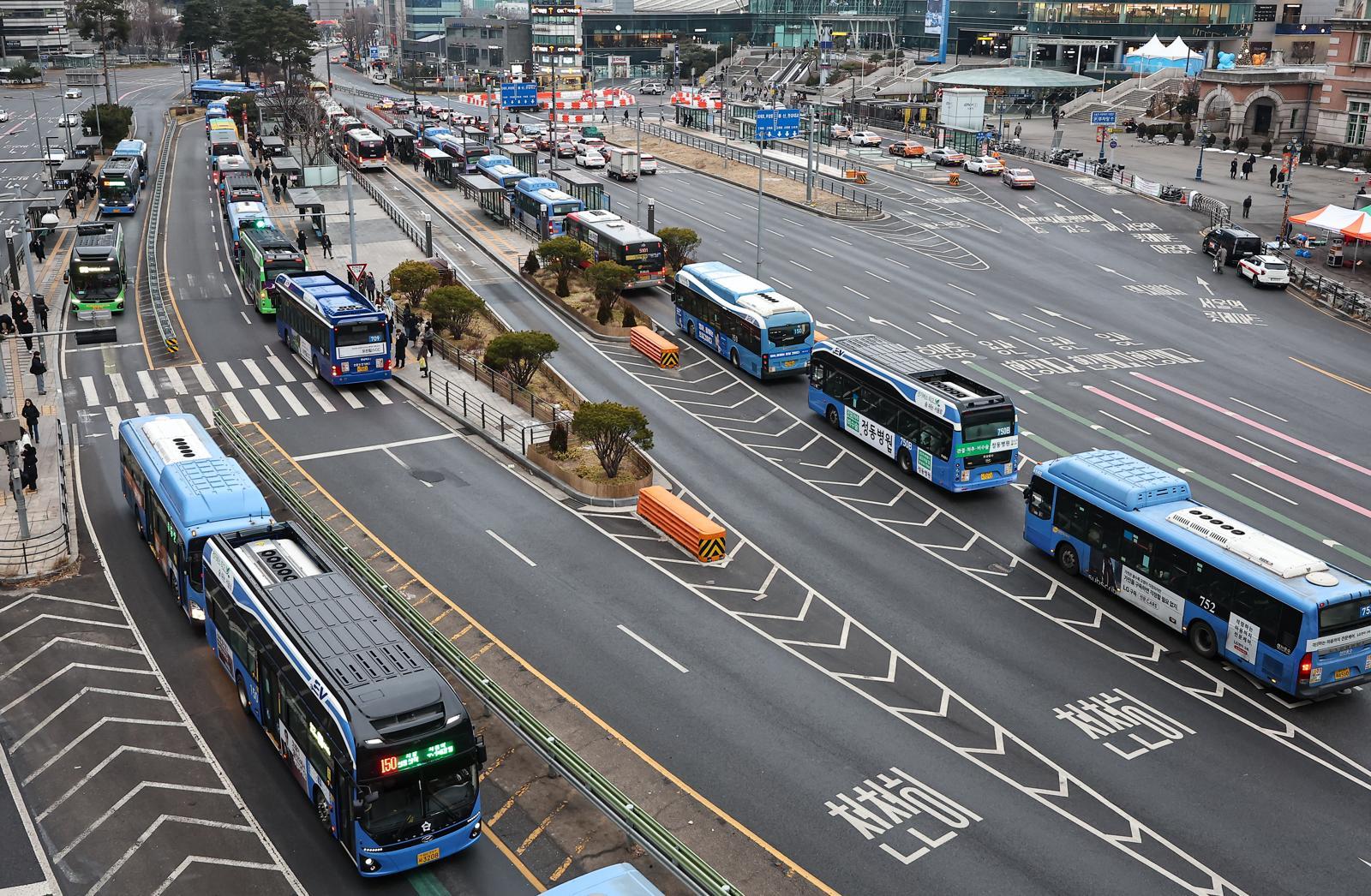 서울 시내버스 노사 간 임금 협상 합의와 파업이 철회된 15일 서울역 버스환승센터에 시내 버스가 오가고 있다. 2026.1.15/뉴스1