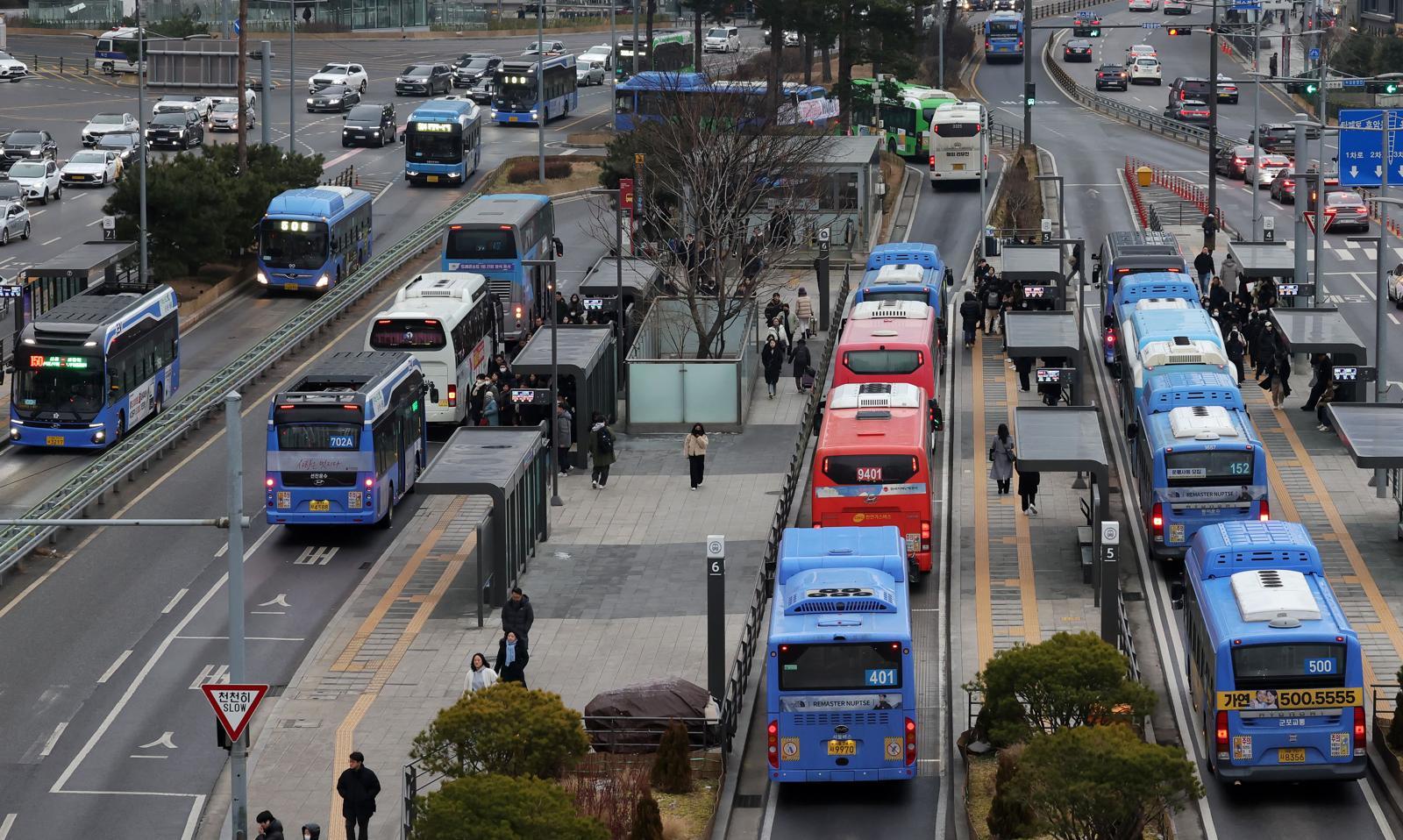 서울 시내버스 노사 간 임금 협상이 타결됨에 따라 정상 운행을 시작한 15일 오전 서울 중구 서울역 버스환승센터에 버스들이 운행하고 있다. 2025.01.15 뉴시스
