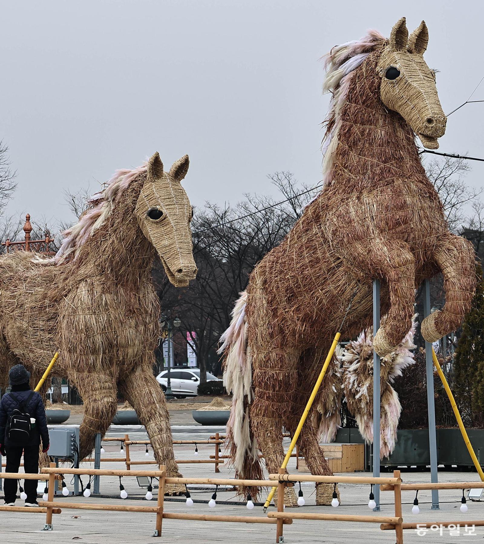 15일 서울 마포구 월드컵공원 유니세프광장에서 한 시민이 억새로 만든 말 조형물을 바라보고 있다. 서울시 서부공원여가센터는 ‘붉은 말의 해’인 2026년 병오년(丙午年)을 맞아 약 4t의 억새로 만든 4.5m 높이 말 두 마리를 3월 31일까지 전시한다. 2018년부터 공원 억새를 재활용해 연초마다 그해를 상징하는 동물을 만들어 선보이고 있다.