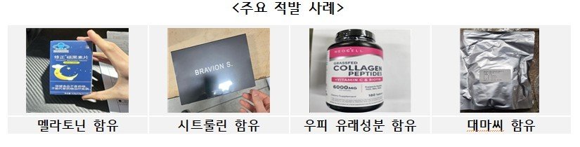 최근 건강에 대한 높은 관심도를 반영하듯 식품의약품안전처 지정 국내 반입 차단 성분인 멜라토닌(수면유도), 우피 유래성분(콜라겐 등 피부·관절효능 성분), 시트룰린(운동능력 향상)을 함유한 경우가 많았다.