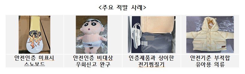 적발 건수 기준으로는 겨울철 스포츠용품인 스노보드와 크리스마스 시즌 용품인 전기부속품·완구가 절반 이상을 차지했으며, 적발수량 기준으로는 온열 팩과 조명기구가 각각 26만여 점, 7만여 점으로 대다수를 차지했다.