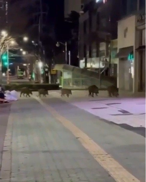 당시 현장에서는 어미로 추정되는 성체 멧돼지 2마리를 따라 새끼 3마리가 도로를 횡단하고 인도를 지그재그로 줄지어 이동하는 모습이 목격됐다.