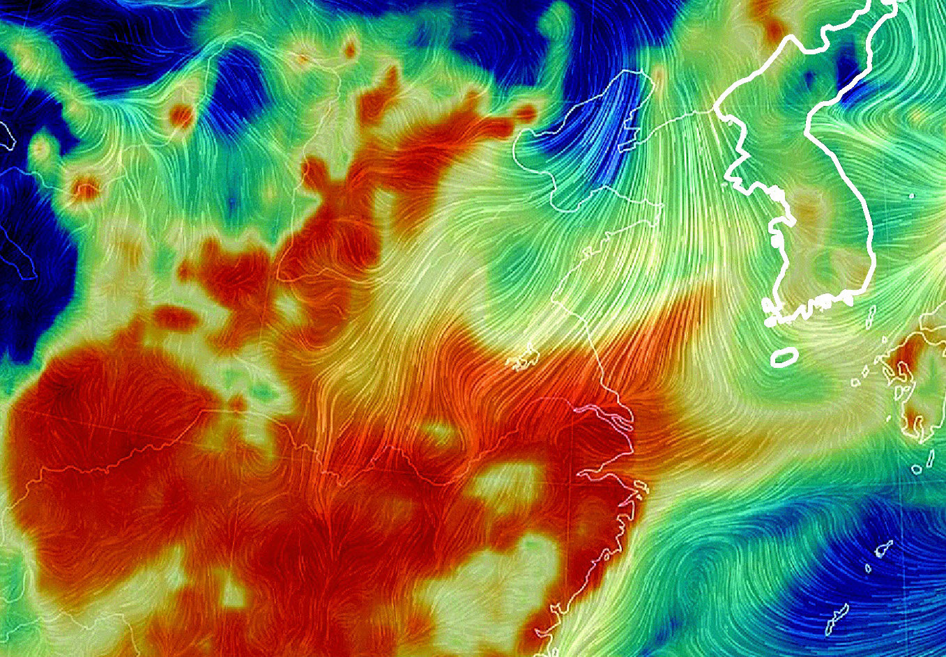 몰려오는 미세먼지 16일 오후 2시 기준 세계 기상정보 사이트 ‘어스널스쿨’에 표시된 한반도와 인근 지역의 미세먼지 상태. 붉은색이 진할수록 미세먼지 농도가 더 높다는 뜻이다. 중국 대륙과 한반도 일부가 붉은색과 주황색으로 뒤덮여 있다. 어스널스쿨 화면 캡처