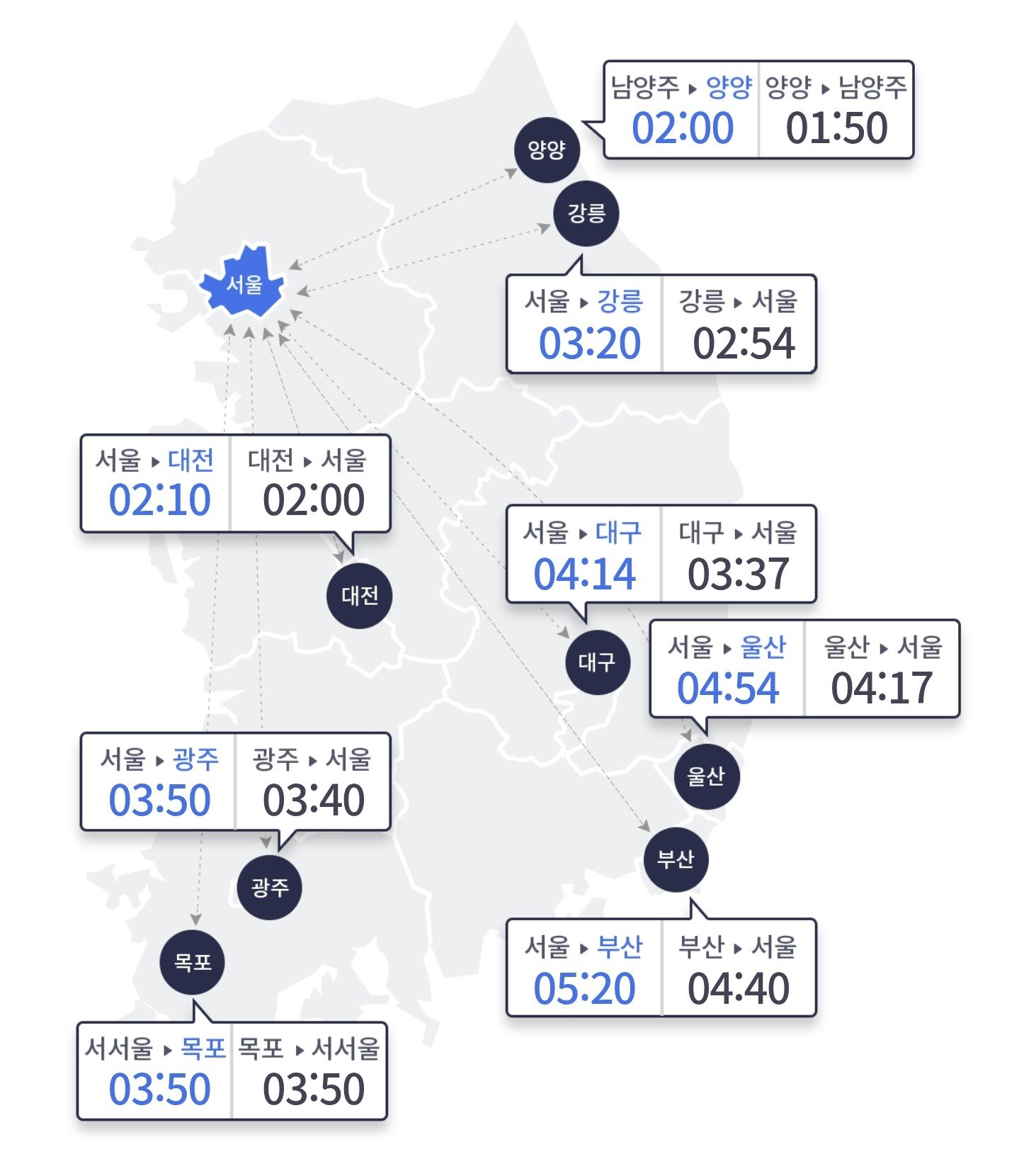같은 기준 서울에서 지방 주요 도시까지의 예상 소요 시간은 △부산 5시간 20분 △울산 4시간 54분 △강릉 3시간 20분 △양양 2시간(남양주 출발) △대전 2시간 10분 △광주 3시간 50분 △목포 3시간 50분(서서울 출발) △대구 3시간 37분이다.