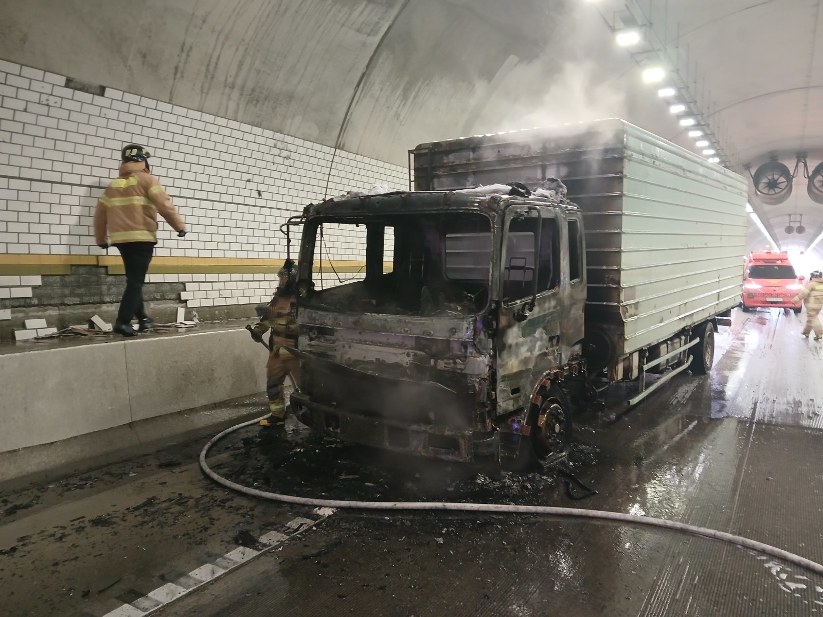 17일 오전 10시 28분쯤 경북 의성군 안평면 서산영덕고속도로 영덕방향 113km 지점 안평 2터널을 주행하던 5톤 화물차에 불이나 소방 당국이 진화하고 있다. 경북소방본부 제공