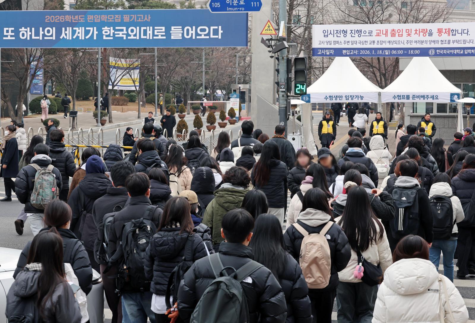 18일 서울 동대문구 한국외국어대 서울캠퍼스에서 2026학년도 편입학 필기고사를 치르는 수험생들이 고사장으로 향하고 있다. 올해 한국외국어대 편입 전형은 서울·글로벌캠퍼스 490명 모집에 7446명이 지원해 평균 15.2 대 1의 경쟁률을 보였다.