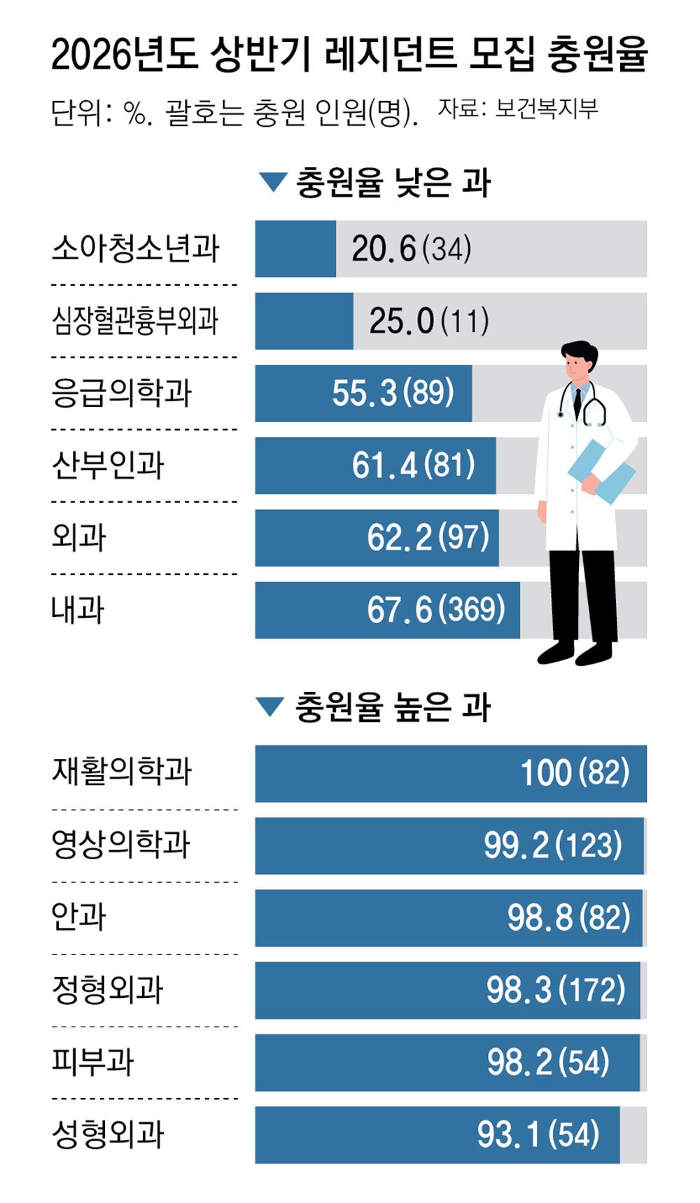 올 3월부터 근무할 신규 레지던트 모집 결과 심장혈관흉부외과, 소아청소년과 등 ‘필수과’의 충원율이 20%대에 불과한 것으로 나타났다. 정부가 지역·필수·공공의료 강화를 내세우며 필수과 보상을 강화하겠다고 밝혔지만, 의정갈등 이전보다 인기가 더 추락한 것이다. 반면 재활의학과와 ‘피안성’(피부과·안과·성형외과) 등 인기과는 정원을 거의 채웠다.