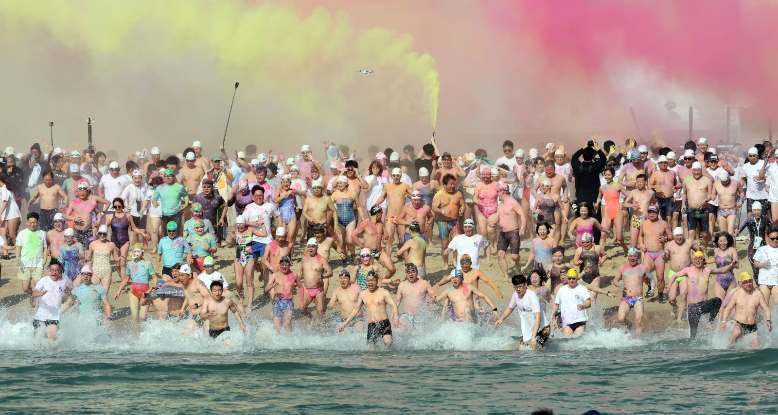 18일 부산 해운대구 해운대해수욕장에서 열린 제39회 해운대 북극곰축제 참가자들이 수영복 차림으로 바다에 뛰어들고 있다. 이날 해운대구 최저 기온은 5도였다. 북극곰축제는 과거 영국 BBC가 세계 10대 이색 스포츠로 꼽은 바 있다.