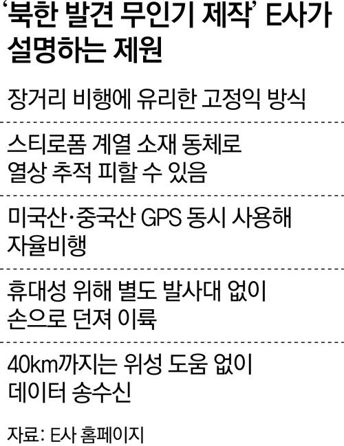 E사는 자본금 50만 원의 소형 스타트업이지만 소형 무인기 제작에 특화된 기술을 갖춘 것으로 알려졌다. 업체 관계자가 출연한 유튜브 등에 따르면 E사의 무인기는 일반 드론과 달리 장거리 비행에 유리한 고정익 형태다. 이는 북한이 격추했다고 주장하며 공개한 기체의 외형과 흡사하다. 또 스티로폼 계열 소재를 사용해 군의 열상감시장비(TOD) 추적을 피하도록 설계했는데, 이 역시 ‘가벼운 형태’라는 북한 측 설명과 일치한다.