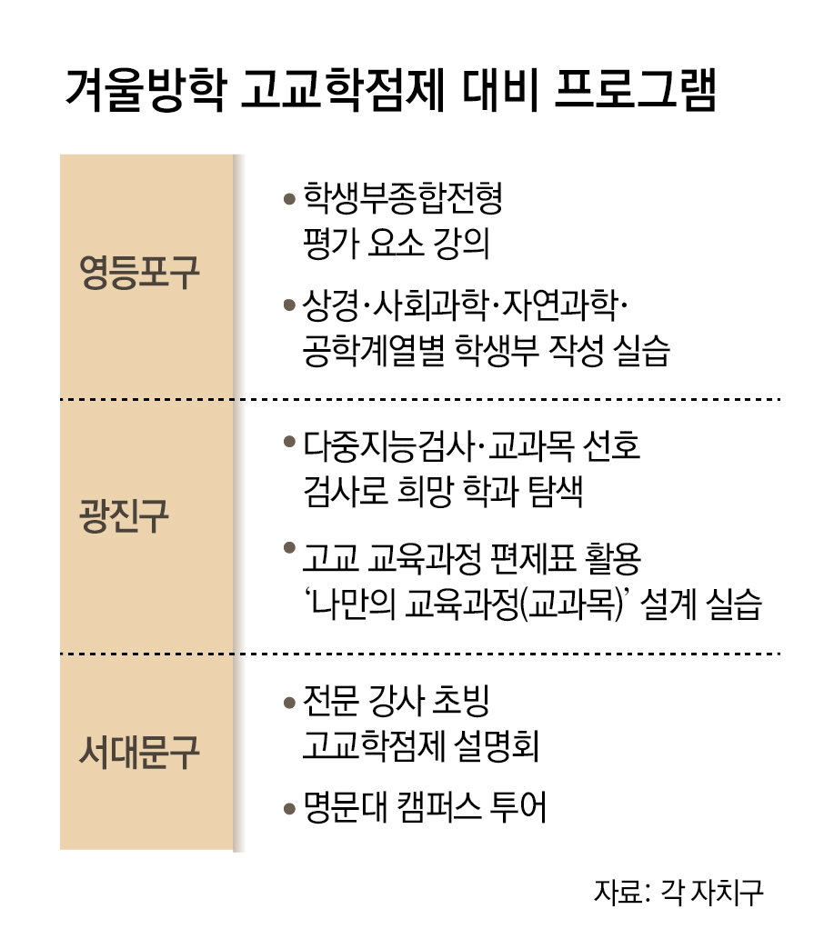 중학교 2학년 자녀를 둔 서울 영등포구 주민 이모 씨(43)는 아이 진학을 고민하던 중 구에서 운영하는 고교학점제 대비 프로그램에 참여했다. 고교학점제 구조와 과목 선택 방식, 학생부 준비 과정을 미리 살펴볼 수 있는 방학 특강이다. 이 씨는 “입시 전문가와 함께 실습을 통해 고교학점제를 미리 경험해 볼 수 있다는 점에서 도움이 됐다”고 말했다.