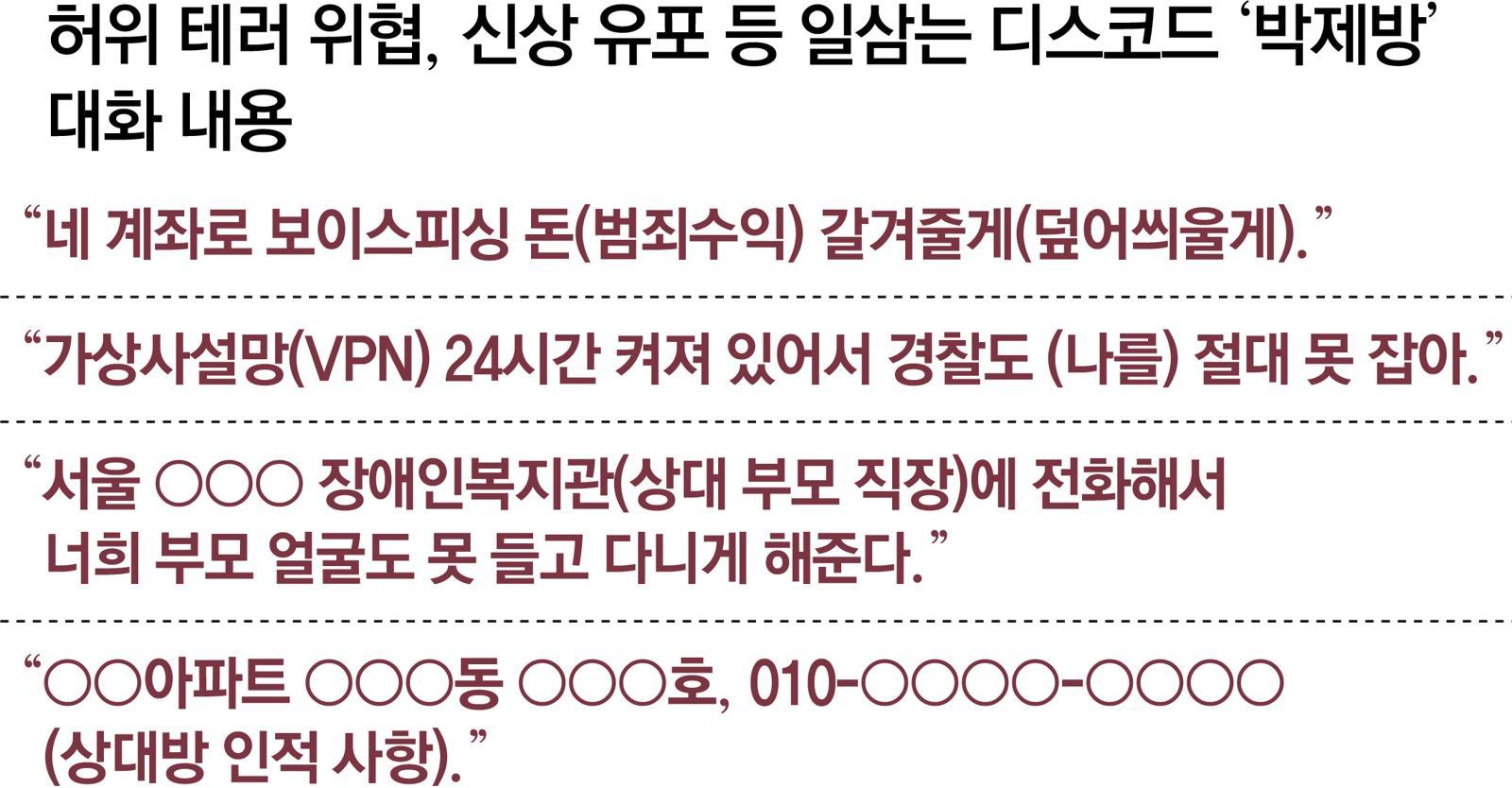 이런 범죄의 전초기지는 디스코드 내 이른바 ‘박제방’이다. 갈등이 생긴 상대방의 실명과 집 주소, IP주소, 부모의 연락처가 적나라하게 올라온다. 취재팀이 한 박제방에 들어가 보니 피해자의 부모가 일하는 곳으로 추정되는 기관을 거론하며 “전화해서 너희 부모에게 개망신을 주겠다”는 협박이 예사로 오갔다.