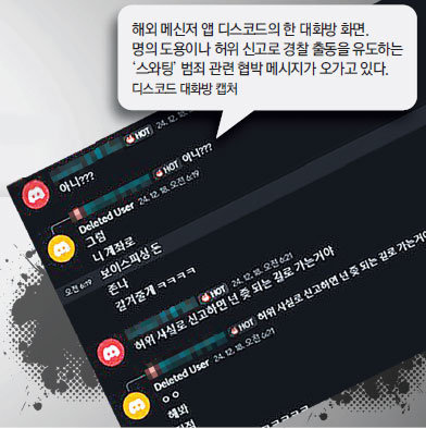 또 다른 방에선 10대로 추정되는 한 이용자가 “네 계좌로 보이스피싱 돈(범죄수익) 갈겨 줄게(덮어씌울게)”라고 위협했다. 대화 상대의 개인정보를 이용해서 하지 않은 범죄도 덮어씌울 수 있으니 복종하라는 위협이었다. 경찰 관계자는 “10대들이 디스코드 내에서 권력관계를 만들고, 이 위계에서 탈락한 이들을 ‘고로시’ 하는 과정에서 스와팅과 박제가 일상적으로 일어난다”고 우려했다.