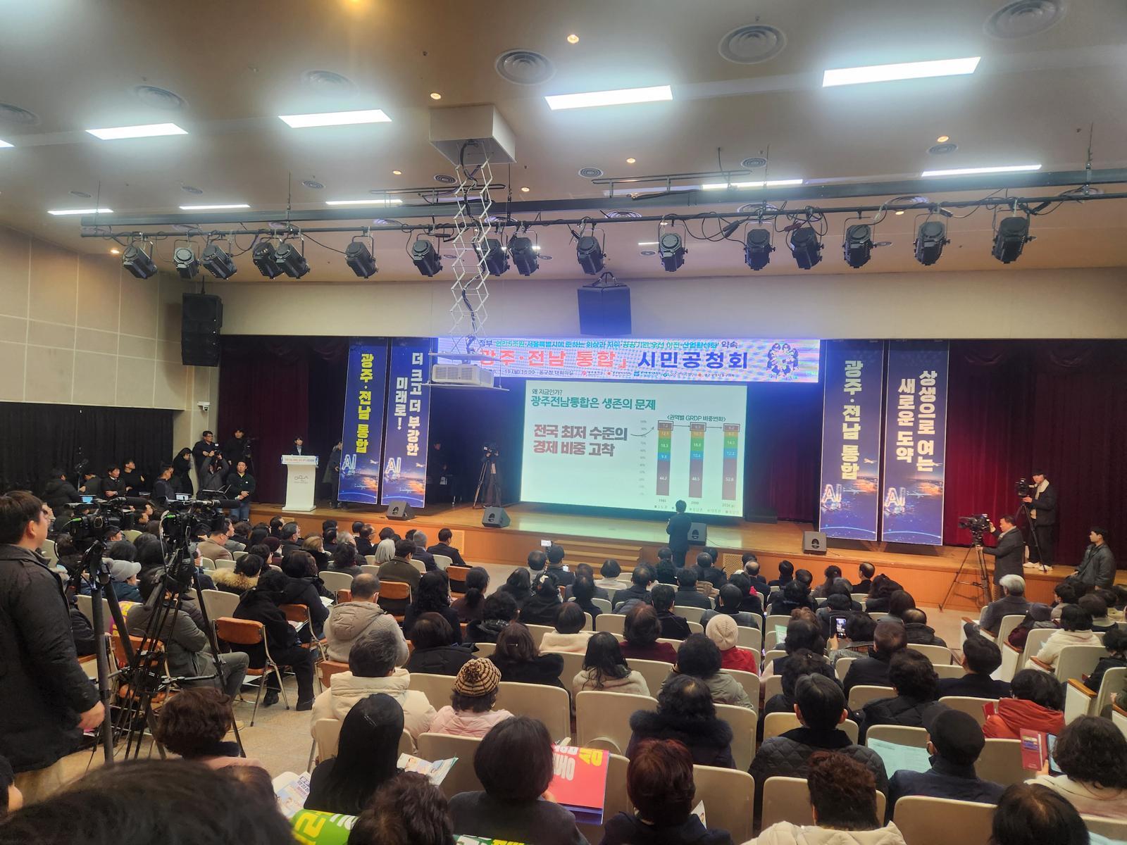 대회의실은 300석 규모인데 500명이 참석했다. 질의응답 시간엔 10여 명의 질문이 쏟아졌다. 한 시민은 “연간 5조 원, 4년간 20조 원 지원은 물론 재정지원이 계속될 수 있는 제도를 마련해야 한다”고 말했다. 이어 “광주·전남 통합청사는 어디에 생기느냐”, “공무원, 교직원 신분은 어떻게 되느냐”, “광주시의회, 전남도의회 입장은 뭐냐”, “농어촌 특례입학 등은 어떻게 되느냐”, “광주와 전남의 갈등 없이 통합하는 방안이 있느냐”, “재산세는 변경되느냐” 등 다양한 질문이 쏟아졌다. 시민 대부분은 질문하기 전에 “통합에 찬성한다”는 입장을 밝혔다.