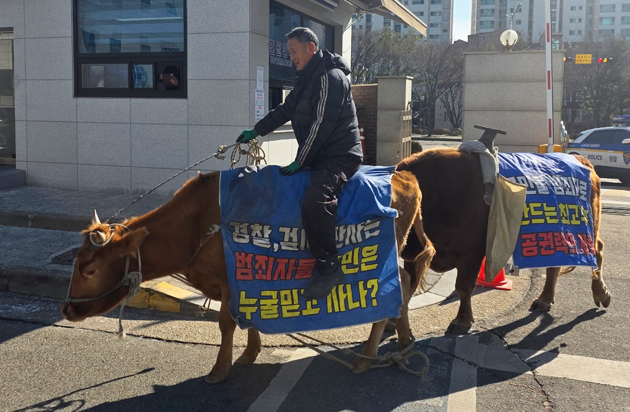 A 씨가 타고 온 소에는 ‘경찰, 검찰, 판사는 범죄자들, 국민은 누굴 믿고 사나’ 등의 문구가 적혀있었다.