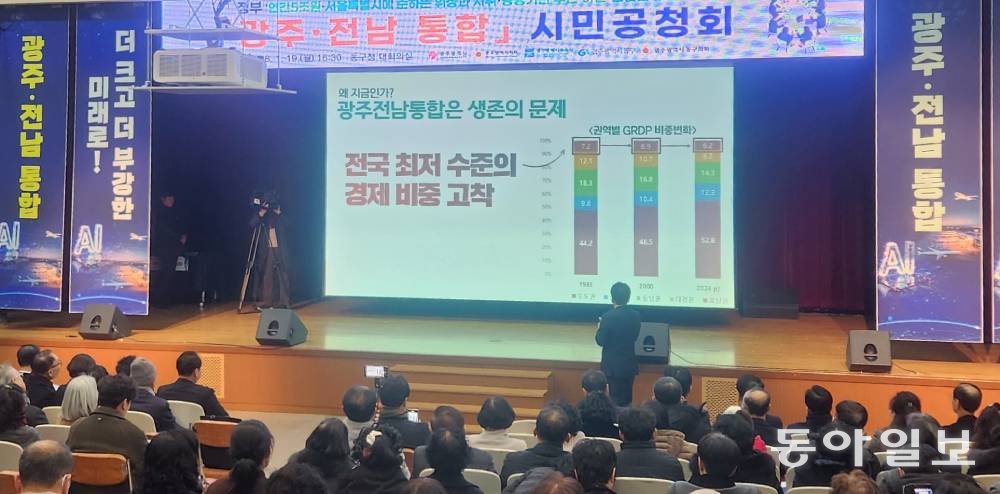 19일 오후 4시경 광주 동구청 엘리베이터를 탄 70대 할머니 3명이 이런 대화를 나눴다. 할머니 1명이 “애들 일자리가 생긴단디 얼마나 좋소”라고 말하자 다른 2명은 “그라제”라며 맞장구를 쳤다. 할머니들은 이후 6층 대회의실에서 1시간 반 동안 진행된 광주·전남 행정통합 권역별 합동 공청회에 참석했다.