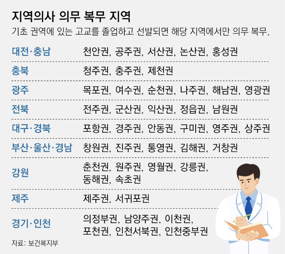 의사 면허 취득 후에는 출신 고교 소재지나 인근 시군에서 의무 복무해야 한다. 가령 경북 영주시의 고등학교를 졸업한 경우엔 영주권인 영주시, 예천군, 봉화군에서 근무해야 한다. 대구 출신 학생이 경북대에 입학했다면 경북의 모든 중진료권에서 근무할 수 있지만 대구에선 근무할 수 없다. 근무 여건이 좋은 대도시 쏠림을 막기 위해서다. 복지부 관계자는 “구체적인 권역별 배정 인원은 교육부에서 결정할 것”이라고 했다.