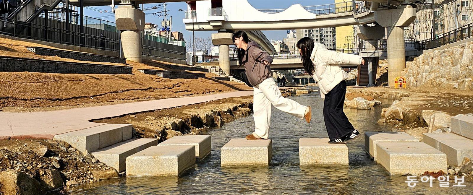 17일 청소년들이 30년 만에 생태하천으로 탈바꿈한 인천 부평구 굴포천 산책로를 걷고 있다. 인천 부평구는 부평1동 행정복지센터∼부평구청 1.5km 구간의 콘크리트를 걷어내고 굴포천을 수변, 친수, 생태 공간으로 새롭게 재구성해 지난해 12월 시민에게 개방했다.