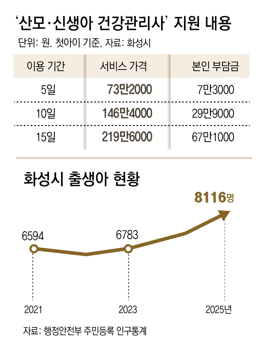 화성시는 이런 지역 특성을 반영해 출산 이후 돌봄 공백을 줄이는 데 정책의 초점을 맞췄다. 방문형 산후 관리 서비스인 ‘산모·신생아 건강관리사’ 제도도 그중 하나다. 지난해 화성시에서 이 서비스를 이용한 산모는 5660여 명에 달한다. 맞벌이 가구와 핵가족 비중이 높은 지역 특성상 가족 돌봄에 의존하지 않아도 되는 방문형 서비스에 대한 수요가 꾸준히 늘고 있다는 게 시의 설명이다. 자격증과 전문 교육을 이수한 관리사가 산모의 집을 찾아가 산후 회복과 신생아 돌봄을 1 대 1로 지원하는 방식이다.