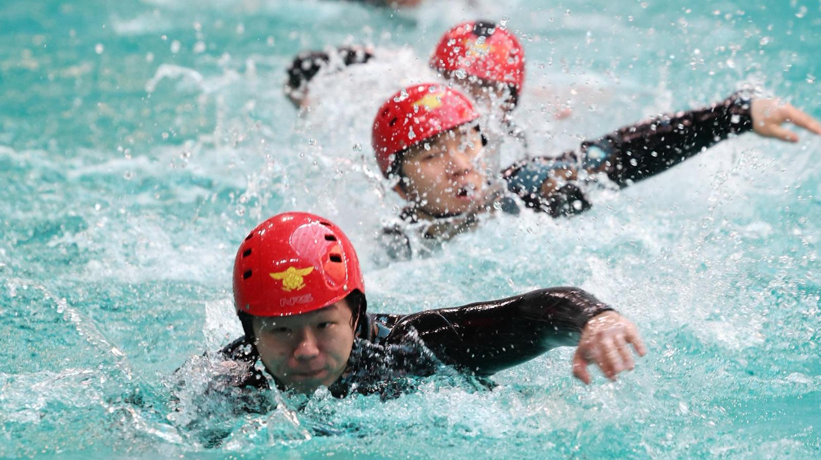 부평소방서 119구조대원들이 21일 오전 인천 미추홀구 문학박태환수영장에서 수난 인명구조 훈련을 하고 있다. 이번 훈련은 겨울철 수난사고 발생 시 신속한 구조와 대원 안전 확보를 위한 동계 대비 훈련의 일환이다.