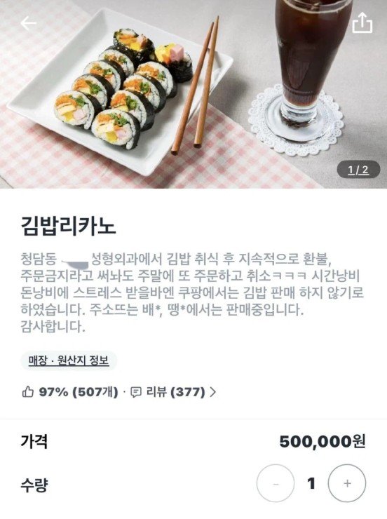 김밥리카노는 김밥과 아메리카노를 세트로 묶어 파는 메뉴로, 사진 속 김밥리카노의 가격은 50만원으로 적혀있다. 사실상 해당 메뉴를 판매하지 않겠다는 의사를 밝힌 것이다.