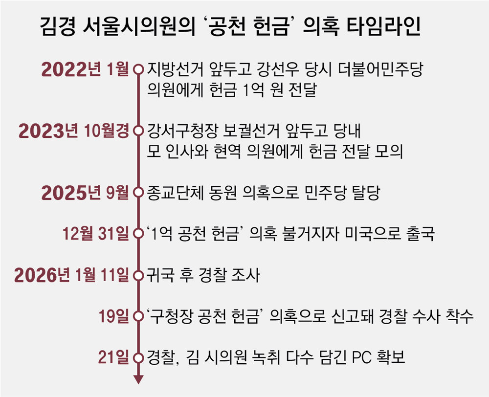 ‘1억 공천 헌금’ 의혹의 핵심 인물인 김경 서울시의원과 여권 인사들의 대화 녹취가 다수 담긴 PC를 경찰이 확보했다. 더불어민주당에서 제명된 강선우 의원 외에도 다른 민주당 현역 의원에게 금품 전달을 모의하는 녹취가 확보되면서 수사도 확대될 것으로 보인다. 핵심은 김 시의원이 2023년 10월 강서구청장 보궐선거 출마를 위해 ‘현역 시의원 배제’ 기준을 바꿔 달라고 현직 의원 등에게 금품을 동반한 청탁을 했는지 여부다.