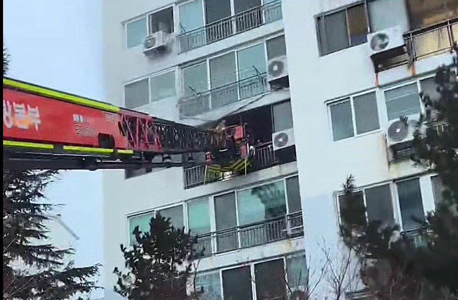 광양소방서가 지난 19일 금호동 아파트에서 화재가 발생하자 사다리차를 동원해 인명을 구조하고 있다. 광양소방서 제공.