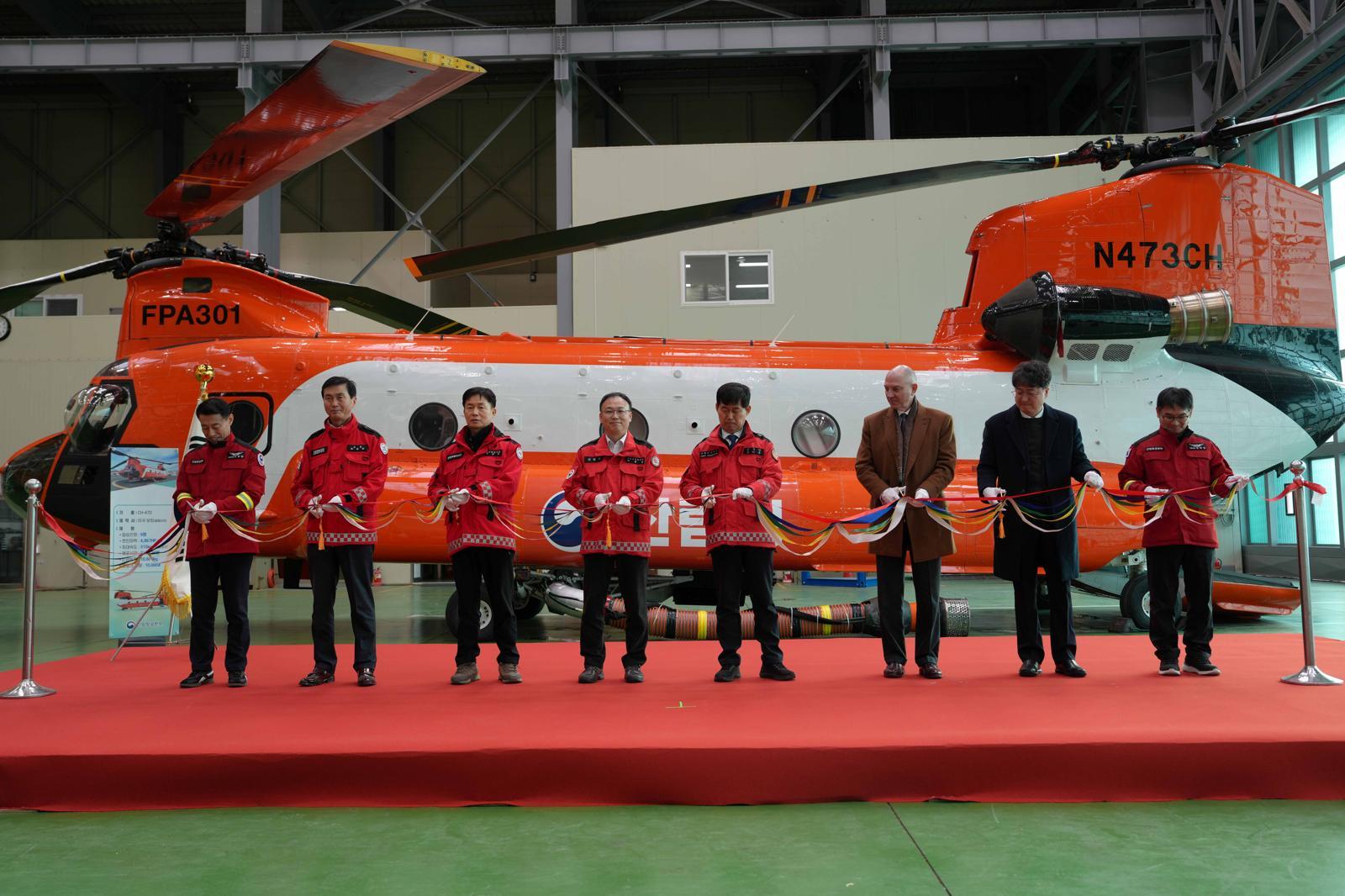 산림청은 23일 강원 산림항공본부에서 대형 헬기 시누크 1대 도입식을 열었다. 행사에 참석한 관계자들이 헬기 앞에서 기념촬영을 하고 있다. 산림청 제공