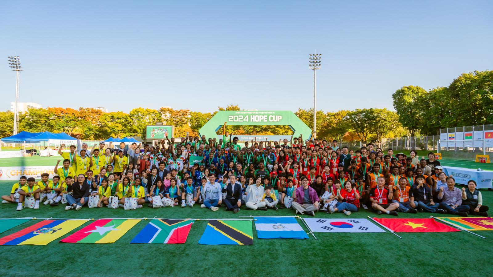 2024년 제3회 호프컵 모든 경기를 마친 후 대회에 참가한 전 세계 결연 아동들이 함께한 단체 사진. 희망친구 기아대책 제공