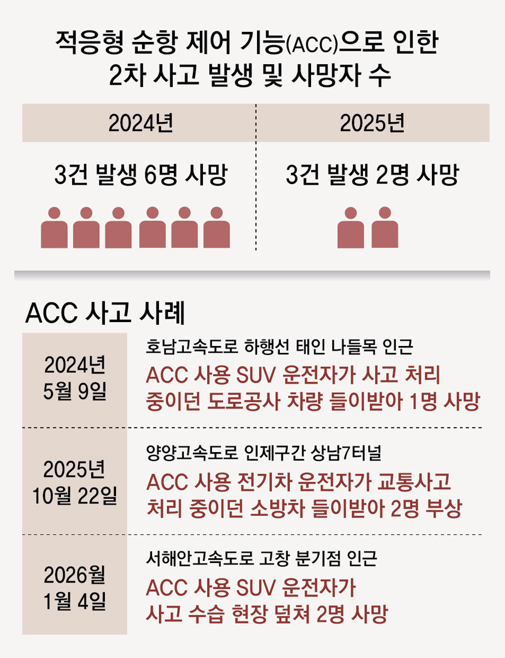 ACC 작동 중 발생한 교통사고는 2020∼2023년 연평균 2.75건에 그쳤지만 2024년에는 12건으로 급증했고 지난해에도 8건이 발생했다. 이 가운데 ACC 사용 중 발생한 2차 사고는 2020∼2023년에는 한 건도 없었으나 2024년과 지난해 각각 3건으로 집계됐다. 도로공사 관계자는 “현재는 사망 등 인명 피해가 발생한 사고를 중심으로 원인을 집계하고 있어 실제 ACC로 인한 2차 사고는 통계보다 더 많을 가능성이 있다”고 말했다.