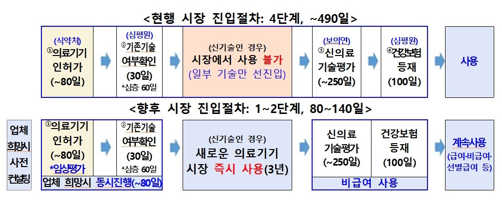 현재 의료기기는 식약처의 허가 후 해당 의료기기를 쓰는 의료 행위가 기존 기술인지 확인하는 절차를 거쳐야 한다. 기존 기술이면 바로 쓸 수 있지만, 새 기술이라면 안정성·유효성을 검증받는 ‘신의료기술평가’를 거쳐야 한다. 기존에도 의료기술의 신속한 시장 진입을 위해 이 평가를 유예하는 제도가 있었지만, 절차가 복잡하고 시간이 오래 걸린다는 지적이 많았다.