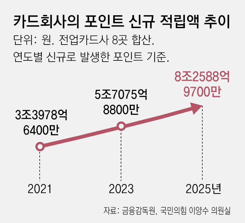 26일 국민의힘 이양수 의원이 금융감독원에서 받은 자료에 따르면 최근 5년(2021∼2025년)간 국내 전업 카드사 8곳(신한·삼성·KB국민·현대·롯데·우리·하나·BC)의 카드 포인트 소멸액은 5018억1600만 원으로 집계됐다. 항공사 마일리지 등 제휴 포인트는 포함되지 않은 수치다. 카드 포인트만 연평균 1000억 원이 넘는 규모가 사라지고 있는 것이다.