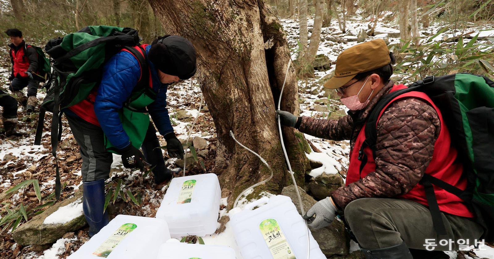 26일 전남 장성군 백암산 기슭의 눈 덮인 계곡에서 가인마을 주민들이 고로쇠나무의 수액을 채취하고 있다. 과거 고로쇠 수액은 통상 3월경 본격적으로 채취했으나 최근엔 기후변화에 따라 그 시기가 1월 중하순으로 앞당겨졌다.